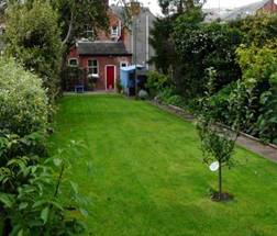 side entry access pathway, leading to large enclosed back garden mainly laid to